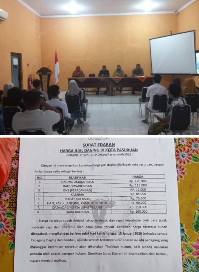 KOTA PASURUAN | KABARNEWSDAY – Paguyuban Pedagang Daging Kota Pasuruan menginisiasi kegiatan sosialisasi “Kenaikan Harga Daging, Sertifikasi Halal, dan Bahaya Konsumsi Daging Ilegal”, Kamis (15/01/2026), bertempat di ruang rapat UPT Rumah Potong Hewan (RPH) Kota Pasuruan, Jalan Ir. H. Juanda, Kelurahan Blandongan. Dalam kegiatan ini, UPT RPH berperan sebagai fasilitator tempat pertemuan, sementara pelaksanaan dan substansi acara sepenuhnya digagas oleh Paguyuban Pedagang Daging.