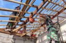 Terlihat para anggota Satgas bekerja penuh semangat meski harus bekerja di ketinggian. Proses pemasangan rangka atap menjadi bagian penting sebelum tahap pemasangan penutup atap dilakukan, sehingga kualitas bangunan dapat terjamin.