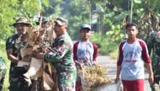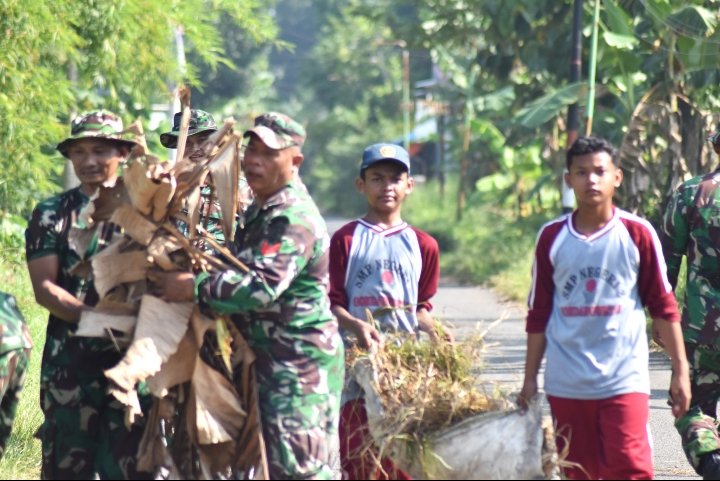 Sejak pagi, prajurit TNI bahu-membahu dengan warga membersihkan selokan, mengangkut sampah, dan merapikan pinggir jalan. Para siswa juga ikut terlibat, mengumpulkan daun kering dan ranting yang berserakan, menciptakan suasana kerja bakti yang penuh kebersamaan.