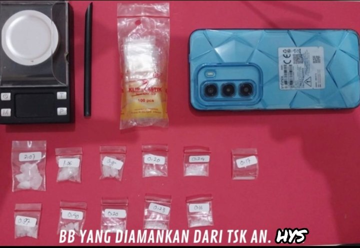 Dalam penggeledahan di rumah tersangka, petugas menemukan 11 kantong plastik berisi kristal warna putih diduga narkotika golongan I jenis sabu dengan berat bervariasi antara 0,067 gram hingga 1,829 gram. Selain sabu, polisi turut mengamankan satu unit timbangan elektrik warna hitam, satu skrop dari sedotan, satu bendel plastik klip kosong, serta satu unit telepon genggam merek Infinix warna biru dengan dua nomor aktif yang diduga digunakan untuk transaksi.