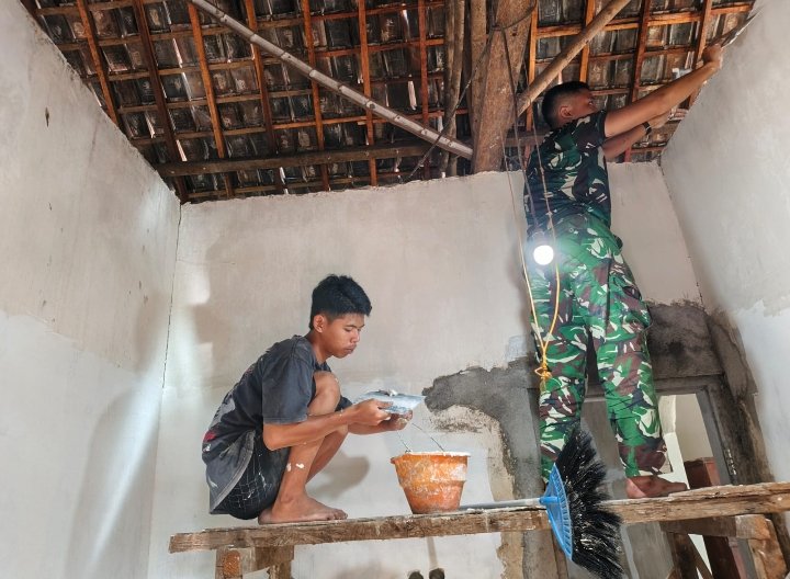 PASURUAN|KABARNEWSDAY-Di sebuah rumah sederhana di Desa Wonosari, Kecamatan Gondangwetan, Kabupaten Pasuruan, prajurit TNI AD tampak sibuk merapikan dinding rumah dengan adukan plamir. Cahaya lampu sederhana menerangi dinding yang sebelumnya kasar agar tampak lebih halus dan rapi.