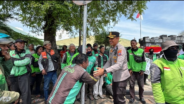 Di sela-sela aksi, Kapolres Pasuruan Kota bersama anggota membagikan air minum dan makanan ringan, sebagai bentuk empati bagi para abang ojol yang memperjuangkan haknya.